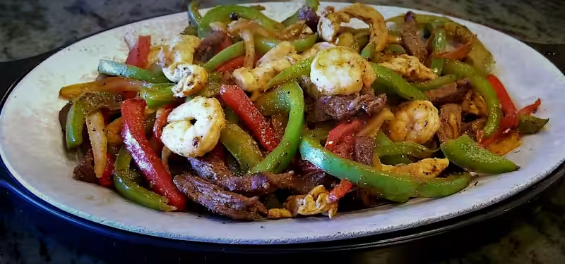 A combination of steak, chicken and shrimp mixed with sauteed onions, red and green peppers. Served with rice and beans, sour cream and guacamole. Your choice of tortillas