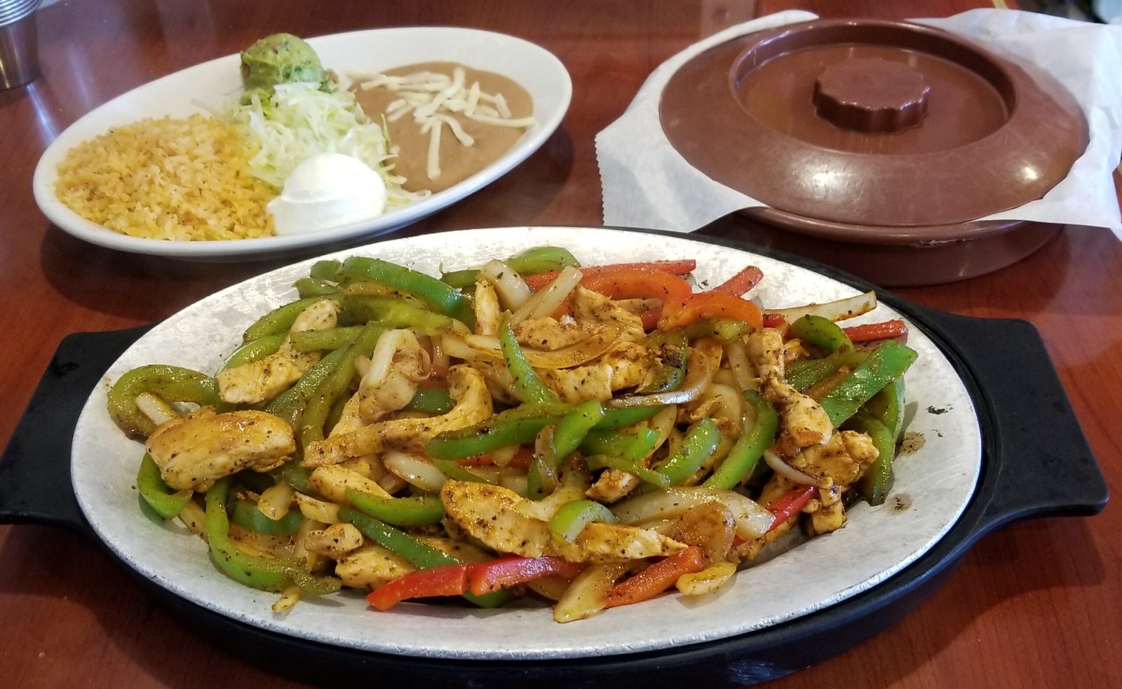 chicken with sauteed onions, red and green peppers. Served with rice and beans, sour cream and guacamole. Your choice of tortillas<