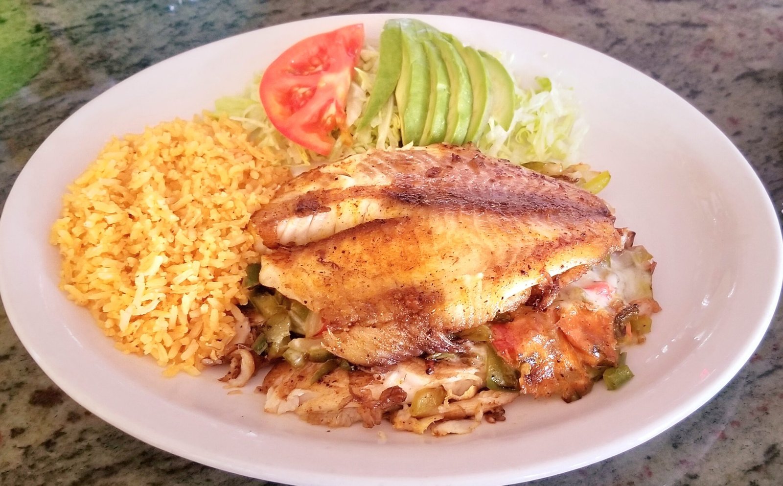 A Stuffed tilapia filled with grilled veggies, ham and cheese. Served with lettuce, avocado and fries