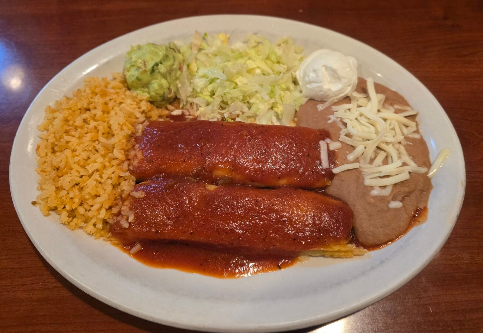 Two pork tamales, simmered in our ranchero sauce. Served with rice, beans, sour cream and guacamole.