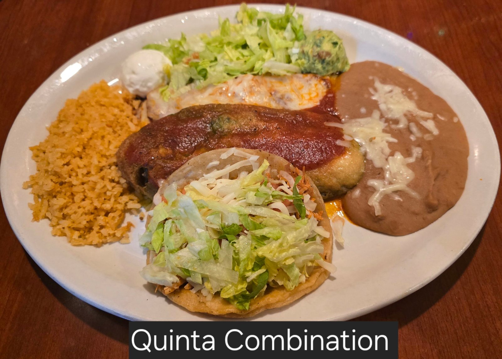 One cheese enchilada, one chicken taco and one poblano stuffed pepper. Served with rice, beans, sour cream and guacamole