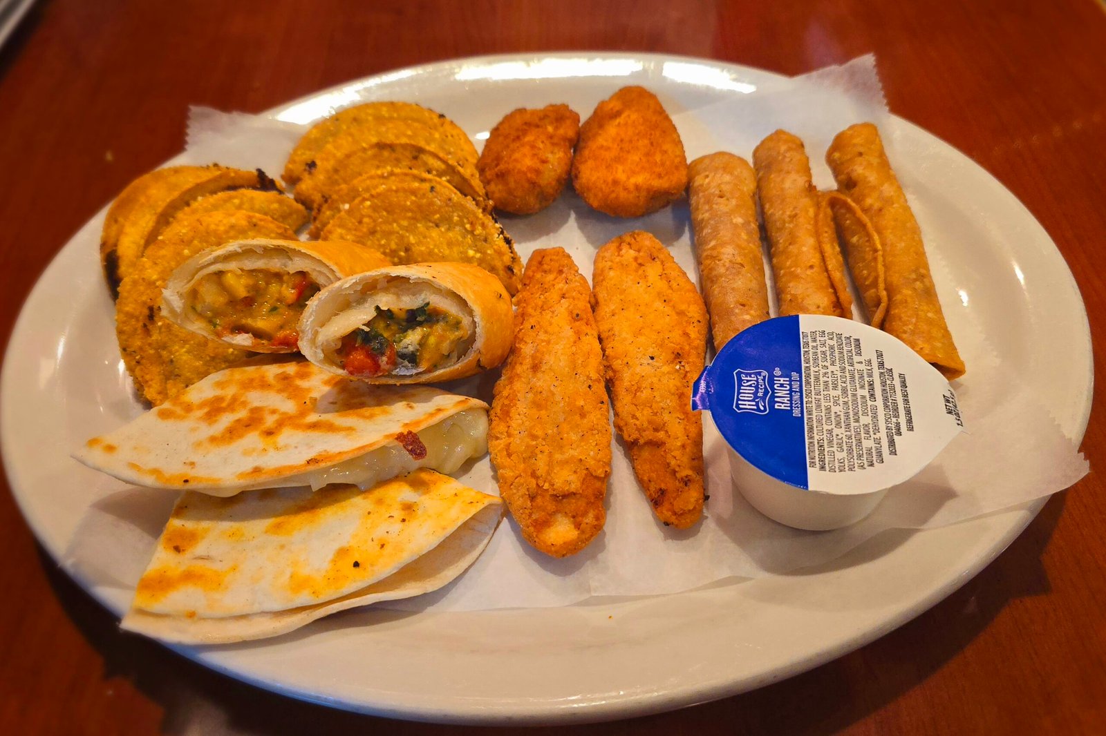 A combination of chicken taquitos, jalapeno poppers, cheese quesadilla and chicken flautas